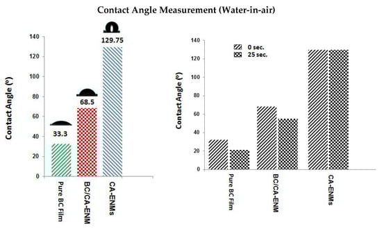 The hydrophilic nature of bacterial cellulose identifies it as an excellent substrate for antibacterial, organic pollutant, and catalyst (improving the efficiency of enzyme loading) related applications. The static water contact angle could be regarded as a representative parameter to evaluate the surface hydrophilic or hydrophobic characteristics of nanocomposite membranes. Figure 8 shows the static water contact angle measurements used to compare the wettability of pure BC film, BC/CA-ENMs, and CA-ENMs. All three types of samples were subjected to a drop of deionized water.