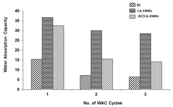 WAC quantifies the percentage of water absorbed in each nanostructure. All specimens were soaked in distilled water for 48 h and dried at room temperature to complete one cycle. The wetting and drying cycle was repeated twice and the results were recorded as shown in Figure 9. CA-ENMs demonstrate higher water uptake and retention, associated with their flexible and porous nanofibrous structure as well as their strong hydrogen bond interactions. However, after the in situ self-assembly of BC nanofibers, the surface of CA-ENMs might have become more compact, offering reduced porosity and inner spaces and hence minimizing the water uptake. Better WAC values shown by BC/CA-ENMs as compared to pure BC films can be assigned to the voids still present in the hybrid mat structure. This indicates that the hybrid structure achieved could offer a procedure to form nanofibrous structures that can absorb a relatively higher concentration of different compounds like enzymes, for improved activity and response.