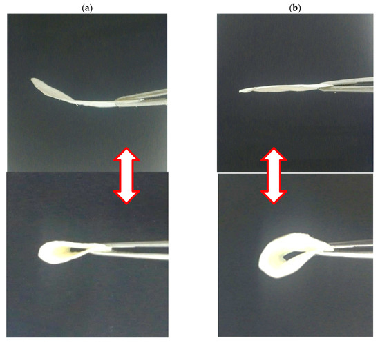 Flexibility is essential for high-strength membranes to be used in various applications and special fields [47]. Qualitative evaluation of flexibility behavior was performed by bending pure BC films and BC/CA-ENM mats using lab tweezers. Figure 10 shows that as-prepared hybrid mats could be easily bent and recovered, indicating improved elasticity over pure BC films. Hence, the current in situ self-assembling approach is also suitable to retain the flexibility of BC hybrid nanocomposite mats.