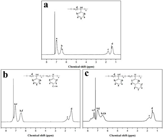 PS, PSCN, and PSNP were characterized by 1H-NMR spectra; the results are shown in Figure 2. Among all the spectra, the strong peaks at 7.27 ppm arise from chloroform. Peaks between 1.36 ppm and 1.78 ppm are attributed to the backbone chains of copolymers. In Figure 2a, peaks between 6.3 ppm and 7.0 ppm are associated with phenyl rings on PS. It can be seen that 1H-NMR spectrum of PSCN is almost similar to that of PS. The difference is the up-field of protons of phenyl rings of PSCN, which can be ascribed to the presence of -CN group []. The -CN group that attached to phenyl ring is a strong electron-withdrawing group, resulting in the up-shifted signals. It is clear that Figure 2c shows extra obvious peaks between 7.37 ppm and 7.71 ppm, which illuminates the existence of naphthalene []. Meanwhile, no obvious peaks related to double bond of monomers appear in all the spectra, indicating the complete depletion of all the monomers and the successful synthesis of copolymers.