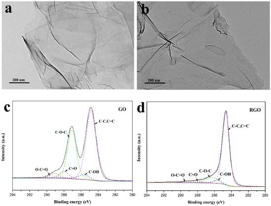 TEM and XPS measurements were conducted to study the morphology and chemical composition of GO and RGO nanosheets. TEM images of GO and RGO are displayed in Figure 3a,b, respectively. As can be seen, GO and RGO both exhibit a laminar and wrinkled structure, indicating the formation of well-exfoliated sheets. In contrast, RGO process a smoother surface than GO, which can be ascribed to the remove of oxygen functional groups via thermal reduction [,,]. The chemical composition of GO and RGO was further identified by XPS measurement. In Figure 3c,d, the peak around 285 eV is for C-C and C=C bond. The peak around 287 eV of GO spectrum is for oxygen functionalities, which can be split into several peaks according to O-C=O, C=O, C-O-C and C-OH bond []. The almost complete disappearance of the peak around 287 eV confirms the effective reduction of GO and successful preparation of RGO.