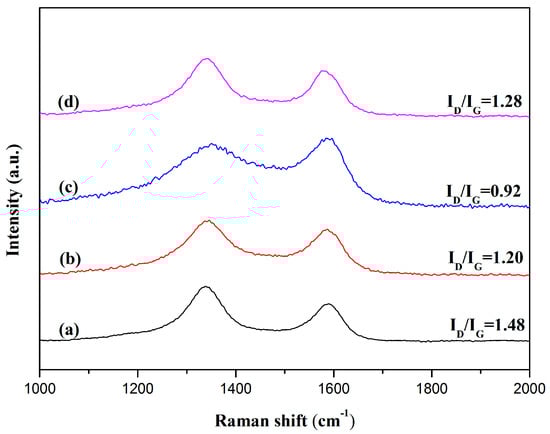 Raman spectra of (a) RGO, (b) RGO-1, (c) RGO-2 and (d) RGO-3.
