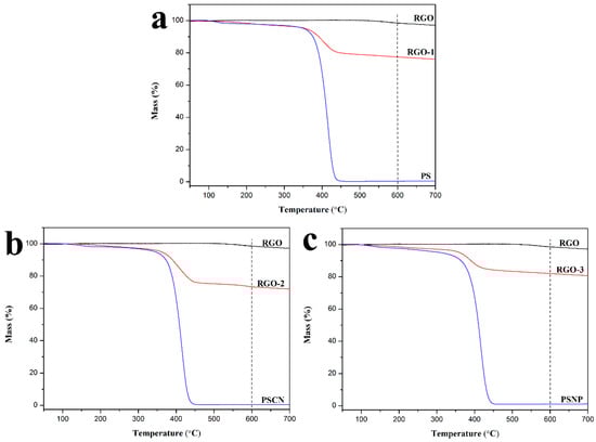 TGA was conducted to calculate the mass of residual polymer on RGO, and then further investigated the interfacial interaction between RGO and the polymer matrix. The obtained TGA curves are displayed in Figure 5. It can be seen that abrupt large thermal degradation of RGO is not observed, despite a temperature increase of up to 700 °C. Both polymers undergo thermal degradation in the temperature range of 400–550 °C, while RGO coated by these polymers shows an equilibrium state at 600 °C. From these results, the mass ratio of the coated polymer to RGO can be deduced. The calculated mass ratios of coated polymers for RGO-1, RGO-2, and RGO-3 are 21.5 wt%, 25.7 wt% and 17.2 wt%, respectively. They show a large deviation after the same treatment. Compared with RGO-1, RGO-3 exhibits smaller mass ratios of coated PSNP, which implies weak interfacial interaction between RGO and polymer matrix. Notably, RGO-2 shows the largest mass ratios of PSCN in comparison with RGO-1 and RGO-3. The different mass ratios of coated polymers prove the different interfacial strength between polymers and RGO, which is consistent with Raman results. In summary, introduction of substituent groups on phenyl rings can obviously promote the π-π interaction at the interface.