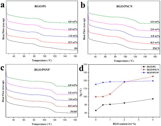 DSC curves of (a) RGO/PS, (b) RGO/PSCN and (c) RGO/PSNP; (d) Tg of nanocomposites with different content of RGO.