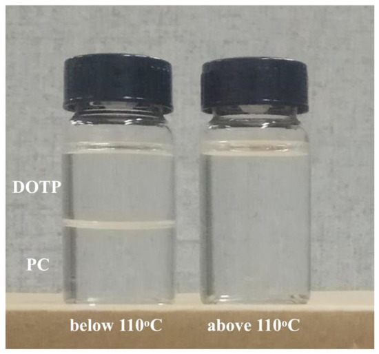 The images of the dioctyl terephthalate (DOTP)/ propylene carbonate (PC) mixture below and above 110 °C.