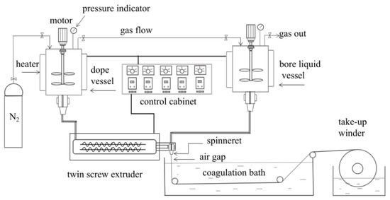 Self-made spinning equipment (Figure 2) was employed to prepare the PVDF hollow fiber membrane. The PVDF content was 25% and the sum of the PC and DOTP was 75%. The weight ratio of PC/DOTP is in the range of 10/0–10/5. The measured PVDF, PC, and DOTP (Table 1) were fed into the vessel and dissolved at 180 °C to form dope. Then, the dope was fed into the twin-screw extruder, extruded from the spinneret at 48 mL·min−1 under the metering pump, and wound on a take-up winder at the linear velocity of 20 m·min−1 after it was quenched in a water bath (20 °C) to form nascent membrane. The flux of the bore liquid is 24 mL·min−1. The diameters of the outer and inner tube for the spinneret were 4 and 2 mm, respectively. The air gap was 0.5 cm. DOTP and the residual PC within the nascent membrane were further extracted by ethanol. The final membrane was dried in air at room temperature and reserved without any post-treatment (for example, being wetted by glycerol aqueous solution).