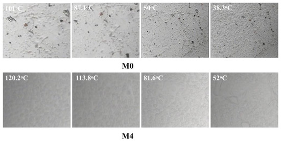 For the PVDF/PC system, neither the coarsening process of the polymer-lean phase (the appearance and growth of liquid droplets), nor the nucleation and growth of the PVDF crystallization, can be observed clearly under the polar optical microscope (Figure 3 (M0)) during the cooling process. Only muddy was found when the temperature decreased to about 50 °C, and the muddy became obvious as the temperature further decreased to 38.1 °C. This suggested that the phase separation indeed occurred for the system, and the temperature of solidification and crystallization for PVDF is very low, which can be ascribed to better compatibility between the carbonyl group in PC and fluorine atom in PVDF. Likewise, for the PVDF/PC/DOTP system, neither the coarsening process of polymer-lean phase nor the PVDF crystallization can be observed during the cooling process (Figure 3 (M4)). The liquid appeared when the temperature decreased to about 113.8 °C, and the liquid size became larger. In particular, the temperature decreased to about 52 °C. It should be pointed out that the liquid observed under the polar optical microscope is not the liquid droplets caused by the polymer-lean phase coarsening process of the L–L phase separation. It should be ascribed to the separation between PC and DOTP and the aggregation of DOTP, which covered up the PVDF crystallization and made it invisible under the polar optical microscope. The above phenomena suggested only the S–L phase separation occurred within the whole experimental process and not the L–L phase separation. Although Tc increased with the increase of the PC/DOTP weight ratio in the phase diagram (Figure 4), the values of Tc for the dopes are all very low and only a little higher than that of the PVDF/PC system. This meant that the addition of DOTP had less influence on Tc of the PVDF/PC system. However, the result is reasonable, and the reasons are as follows. No turbidity and crystallization can be observed when the temperature is higher than 110 °C, suggesting that the Tc for the system is lower than 110 °C. The mass transfer between PC and DOTP should be faster than the PVDF crystallization because of the slower cooling rate (10 °C·min−1). This meant that as the temperature decreased to 110 °C and the separation between PVDF and PC occurred, PVDF will dissolve in PC until the temperature further decreased to the crystallization temperature for the PVDF/PC system. This is true of the PVDF crystallization within PC regardless of the addition of DOTP. Finally, the difference of Tc is not obvious for the different PC/DOTP weight ratios. The slight increase of Tc with the addition of DOTP can mainly be ascribed to the effect of PVDF content in PC. That is, the higher the PC/DOTP weight ratio, the higher the PVDF content in the PVDF/PC system, which in turn resulted in an easy nucleation of PVDF.