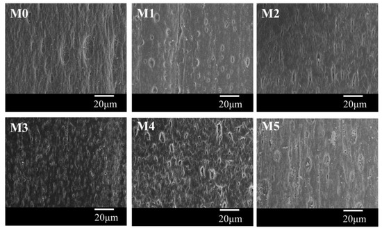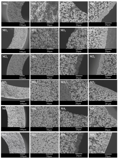 SEM images of the membrane. The whole cross section (MX1), magnification of the cross section near the center (MX2), cross section near the inner surface (MX3), and cross section near the outer surface (MX4). X represents the sample code from 0 to 5.