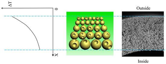 Figure 5 showed the cross-sectional images of the membrane. The spherulites can be observed from all samples, and this further proved that the S–L phase separation occurred for the system during the cooling process. This demonstrated that the quantity of the non-diluent in this paper is not enough to result in a L–L phase separation even if the addition of DOTP will weaken the interaction between PVDF and PC. The asymmetric gradient structure can be found from the whole cross section. That is, there existed a skin layer near the outer surface. The size of the spherulite increased gradually from the outer surface to the inner surface and finally, to no skin layer near the inner surface. This gradient structure could mainly be ascribed to the difference of the temperature gradient, which in turn led to the different crystallization rate for PVDF at different positions of dope. In detail, the difference between the dope and the water bath is much bigger than that between the dope and the bore liquid. Therefore, the heat transfer rate slowed down in sequence from the outer surface to the inner surface, or it corresponded to the decrease of the nucleation rate and facilitated the crystal growth rate from the outer surface to the inner surface. Finally, the faster heat transfer rate led to a dense skin layer or a spherulite of a small size, while the slower heat transfer rate resulted in a spherulite of a big size or a porous skin layer. The schematic diagram of the gradient structure formation is shown in Figure 6. Although there existed the mass transfer between PC and the water bath due to the water solubility of PC, no finger-like pores can be found, and this suggested that compared with TIPS, the influence of NIPS on the bulk membrane structure is negligible, which is different from the reports by Jung [45] and Lee [36]. This may be ascribed to the fact that unlike the PolarClean solvent, PC cannot be soluble with water at any proportion (the solubility is about 240 g·L−1 at room temperature) and thus cannot bring about an instantaneous demixing of NIPS. Compared with the pristine membrane (M0), the spherulite size became bigger for the membranes using the PC/DOTP mixture. This can mainly be explained from the analysis in Section 3.1, which showed that the PVDF content in PC increased with the higher PC/DOTP weight ratio. The higher polymer content facilitated the growth of crystal and led to a larger spherulite size. Moreover, not only the space between the spherulites increased with the addition of DOTP, but also the spherulites became irregular and some cavities on the surface of the spherulite can be seen (as shown in the higher magnification of the center cross-section in Figure 5). These can mainly be ascribed to the separation between PC and DOTP and the resulting DOTP aggregation. The S–L phase separation process can be depicted as “nucleation-growth” (NG) mode. For the PVDF/PC system of this manuscript, the membrane formation process is the same as that reported in the literature. However, the separation between PC and DOTP occurred as the temperature decreased to 110 °C for the PVDF/PC/DOTP system, and the resulting agglomeration and growth of DOTP are bound to influence the PVDF crystallization process. In detail, the agglomeration and growth of DOTP will occupy the space, which not only enlarged the space between the spherulites, but also hindered the further growth of polymer crystallization and resulted in an irregular spherulite with cavities on the spherulite surface after the aggregated DOTP was extracted. The higher the PC/DOTP weight ratio, the bigger the size of cavity. Finally, the interconnection of the pores was improved.