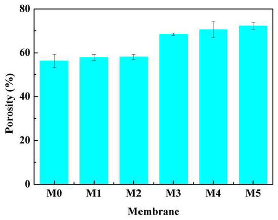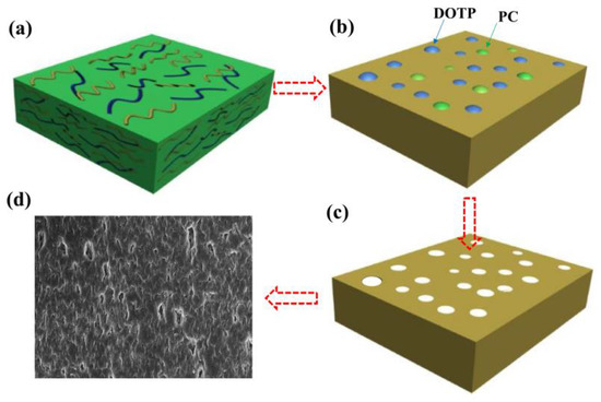 The relationship between the PC/DOTP weight ratio and porosity is shown in Figure 12. It can be seen that porosity increased from 57.9% to 72.2% when the PC/DOTP weight ratio increased from 10/0 to 10/5. This can be ascribed to the fact that the density of PC (1.2 g·L−1) is larger than that of DOTP (0.984 g·L−1). That is, the greater the addition of DOTP, the smaller the density or the higher volume of the diluent mixture. Therefore, the higher porosity is achieved after the extraction of the diluent mixture.