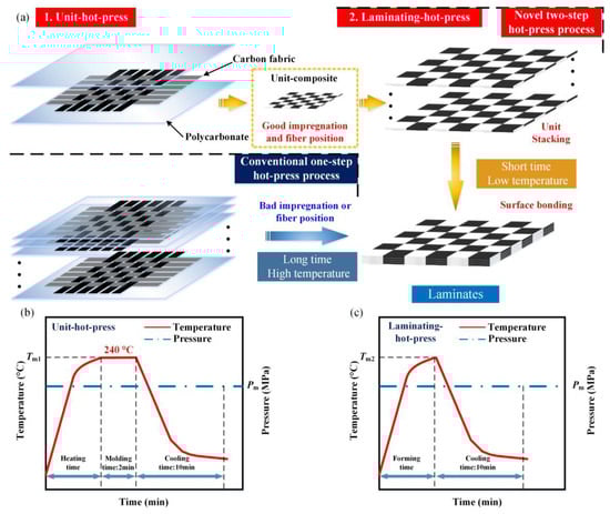 As Ramalakshmi et al. [] illustrated, in addition to affording loads, the matrix also played a role of holding the fiber phase in the desired position. Therefore, a separate process called a two-step hot-press technology has been identified and takes advantage of the reprocessing property of thermoplastic resin. This technique consists of unit-hot-press and laminating-hot-press in sequence, which is a quick and precise way that ensures both the CF tow position and impregnation. In addition, the fabrication parameters can also be optimized more precisely layer-by-layer.