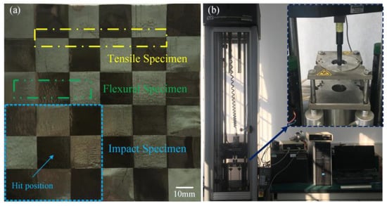 The impact resistance of multi-CFPLs was tested following the ASTM Standard D 7136 [], using a drop-weight impact machine (9250 HV, Instron, Norwood, MA, USA). Each impact test was performed by dropping a 12.7 mm-diameter hemispherical striker with a 17.6055 kg mass on a specimen mounted in a pneumatic fixture. Subsequently, the corresponding dynamic response of the specimen was recorded and analyzed. Each impact specimen was tailored to the dimensions of 60 mm × 60 mm, which was large enough to be completely clamped in the fixture as the blue-dashed outline shown in Figure 2a. Other testing conditions included 800 kHz sampling rate, 15 J applied energy, and 86.9 mm drop height. To eliminate potential testing errors caused by strike position difference, all impact specimens were penetrated in the middle of the CF tows rather than the edge [].