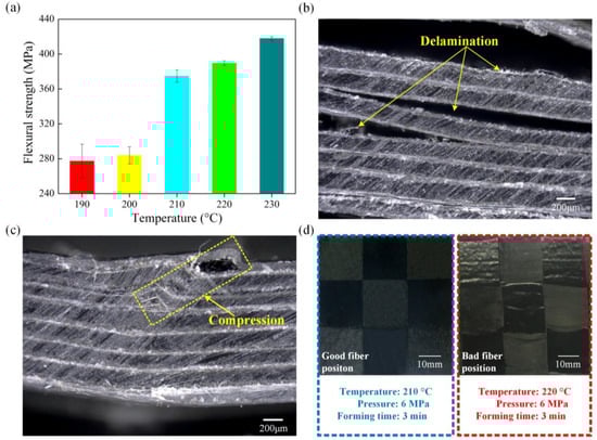 Figure 3 shows the flexural properties of multi-CFPLs prepared by different forming temperatures in the laminating-hot-press. The results indicate that the flexural strength increases with increasing forming temperature. As the forming temperature increases from 190 to 230 °C, the flexural strength increases from 277.22 to 417.89 MPa. However, there is a rapid growth gap in this work between 200 and 210 °C, which divides the growth rate of flexural strength into two parts. This variation tendency can be explained using two typical failure images illustrated as the insets in Figure 3. When the forming temperature is below 210 °C, the as-prepared multi-CFPLs show several obvious delamination failure areas within each unit-CFPL layer, indicating insufficient interfacial bonding strength. This defect is similar to the interlaminar shear mode described as the Standard ASTM D2344 []. When the forming temperature is above 210 °C, the failure image of the multi-CFPL looks identical to the failure image caused by compression failure [] owing to exceeding the compression limit of the material. No obvious delamination trails were found at this temperature, implying sufficient interfacial bonding strength among each of the unit-CFPLs. Therefore, the increase in the forming temperature in the laminating-hot-press can promote the impregnation between CF and PC and transfer the failure from interlaminar shear to compression fracture, thereby significantly enhancing the flexural ability of the laminates. However, there is a maximum limitation on the forming temperature. An excessively high forming temperature will generate an extremely high scouring force in the melting matrix and induce quality defects. As shown in Figure 3d, the CF location and the pre-determined uniformity associated with the weaving process are easily disturbed by a high scouring force, thereby reducing the stability of the quality of the laminated composites []. Under a comprehensive consideration, a set of optimal laminating parameters for this work was selected at 210 °C forming temperature and 6 MPa forming pressure.