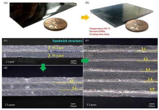 To evaluate the impregnation quality of the CF-matrix and the interfacial bonding quality of the layer–layer, several multi-CFPLs with 1, 2 and 5 layers of unit-CFPL were carefully cut to observe their cross-sections, as shown in Figure 4c–e. All sections exhibit a good bonding interface, i.e., all unit-CFPLs combine well with each other after laminating-hot-press. In addition, there is no visible void, bubble or delamination inside each unit-CFPL. As claimed by Moaseri et al. [], a good combination of carbon fabric and PC films suggested outstanding mechanical properties. Moreover, there are clear boundary lines between the weave carbon fabric and PC films due to their substantially different material compositions. These lines are straight and tidy as well as parallel to each other, similar to the pre-arranged unit-CFPL layers. This appearance can be used as evidence that the major properties of unit-CFPLs may be reserved in their as-prepared multi-CFPLs.