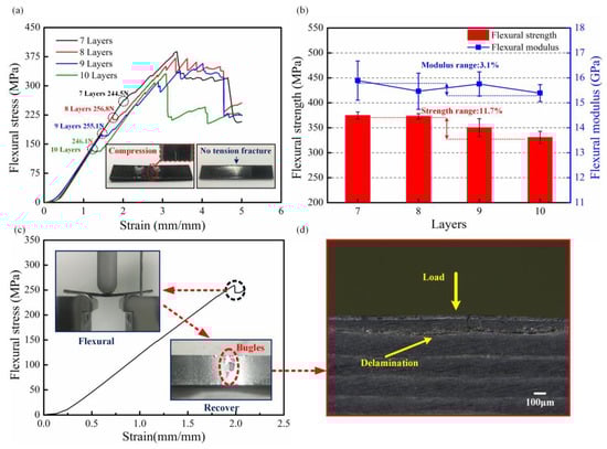 Figure 5b shows the flexural strengths and modulus of multi-CFPLs versus the unit-CFPL layer. In general, the flexural strength presents a slight tendency to decline as the layers of the unit-CFPL increase. For instance, the flexural strength decreases from 374.78 to 330.75 MPa as the layer numbers increase from 7 to 10. Katsiropoulos et al. [] reported that with increasing numbers of layers in a laminate, some bond line defects (e.g., voids, kissing bonds, and porosity) were increased, adversely affecting the mechanical properties of bonding joints. Moreover, in a flexural test, the bending moment and the shear force exist simultaneously, resulting in a mixing failure mode including delamination, tension and compression []. Therefore, the flexural strength of a multi-CFPL is hard to keep stable with the growth of the unit-CFPL layers. However, the flexural modulus of a multi-CFPL is relatively stable. As the layer number increases from 7 to 10, the flexural modulus fluctuates slightly up and down between 15.39 to 15.89 GPa, which demonstrates the stability of the rigidity of this laminate. This behavior is also reflected in the Hookean region of stress–strain curves.