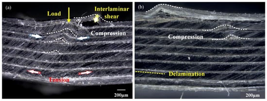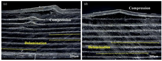 Figure 8d,e are two partial enlarged images taken of the fracture of the unit-CFPL and 5-layer multi-CFPL. The results indicate that there are three types of failure behaviors observed in these images: (i) Matrix failure, observed as the cracking of the matrix phase parallel to the fibers; (ii) delamination of the laminate layers due to interlaminar stresses; and (iii) fiber failure such as fiber breakage and fiber buckling. These characteristics have also been reported by Thanomsilp and Hog []. Compared with conventional composites [,], the matrix failure of the multi-CFPLs is much more apparent because of the relatively high matrix fraction, which achieves more than 80% in height. Moreover, the delamination defect of multi-CFPLs was found to increase as the growth of the unit-CFPL layer numbers. In addition, these laminates are also damaged due to the full penetration of the striker during impact tests.