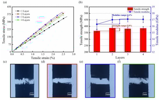 Figure 7 illustrates the tensile properties of several multi-CFPLs with 2- to 4-layer unit-CFPLs in terms of their stress-strain responses, strengths and failure morphologies. In addition, a pristine unit-composite is set as a comparison. As shown in Figure 7a, all tensile specimens exhibit a specific linear-elastic period followed by a dramatic fracture without a yield stage, which is a classical tensile behavior of the CF-reinforced plastic composites with a high modulus []. Moreover, the elongations of all these multi-CFPLs are nearly equal, and their values are fluctuating around at 2.5%, while the unit-composite has a slightly higher elongation at 2.67%. For the tensile strength, all these multi-CFPLs appear to have an approximately constant value of approximately 380 MPa, which is slightly higher than the value of the unit-CFPL (360 MPa). This similar comparative result can also be observed in the aspect of the tensile modulus. The results indicate that the tensile modulus of all multi-CFPLs is as high as approximately 17 GPa, which is higher than the tensile modulus of the unit-CFPL (16.3 GPa). All these comparison differences (elongation, tensile strength and modulus) between the multi-CFPLs and unit-CFPL are attributed to the action of the second hot-press step. On the one hand, the multi-CFPLs become denser after the laminating-hot-press because some residual pores in its components (unit-CFPLs) were fully occupied. Therefore, the CF volume fractions of all multi-CFPLs were increased. On the other hand, the CF-PC interfacial bonding strength that was enhanced due to that additional holding time brought by the laminating-hot-press is beneficial to improve the impregnation process in porous material []. These two aspects are helpful to enhance tensile strength and modulus as well as reduce elongation.