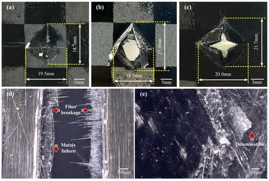 Figure 8a–c show some typical impact fracture images captured on the multi-CFPLs with 1, 3 and 5 layers. They demonstrate typical four-sided pyramidal (tetrahedral) fractures, attributed to the bi-directional layup of the woven fabric composites []. All multi-CFPLs show a similar fracture morphology and exhibit a typical brittle fracture mode, which is definitely distinct from the plastic deformation of the PC sheet []. In addition, the fracture area of each laminate does not present an obvious variation trend with increasing layer numbers. The fracture area is limited by the unit cell area of weave carbon fabric, whose length equals the width of the pristine CF tow.
