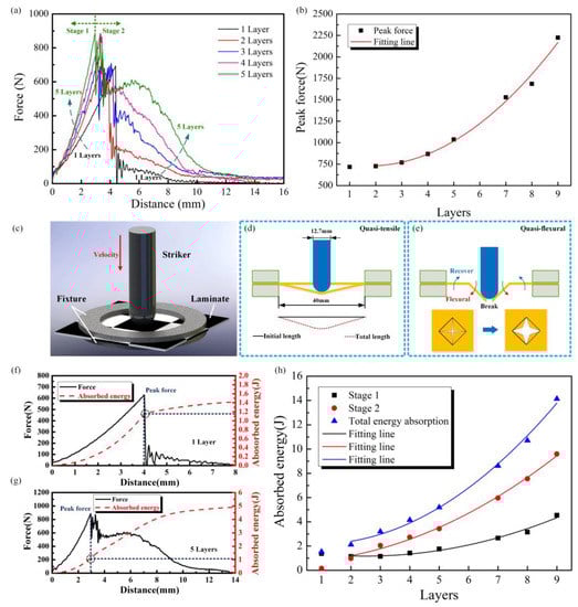 The impact properties of multi-CFPLs prepared by differently layered unit-CFPLs: (a) The force-distance curves of the multi-CFPLs with 1- to 5-layer unit-CFPLs; (b) the curve of the peak force versus layers; (c–e) are the schematic diagrams of the impact movement, a quasi-tensile stage and a quasi-flexural stage in an impact process; (f,g) are the energy absorption-distance and force-distance curves of the multi-CFPLs with 1-layer and 5-layer unit-CFPLs, respectively; (h) is the curves of energy absorption versus layers.