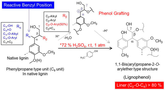 - Funaoka, M.; Fukatsu, S. Characteristics of lignin structural conversion in a phase-separative reaction system composed of cresol and sulfuric acid. Holzforschung 1996, 50, 245–252. [Google Scholar] [CrossRef]