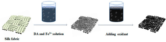 PDA–Fe3+–silk fabric was performed by the “dip-reduced-dry” method (Figure 1). The different silk fabric samples were treated according to the following steps, respectively: DA treatment (DA): The degummed silk fabric was immersed into DA solution (2 g·L−1) for 50 min at 50 °C. DA and Fe3+ treatment (DA–Fe3+): the degummed silk fabric was immersed with DA solution (2 g·L−1) and Fe3+ solutions for 50 min at 50 °C. DA and Ox (sodium perborate tetrahydrate) treatment (DA–Ox): the degummed silk fabrics was immersed with DA solution (2 g·L−1) for 50 min at 50 °C. It must be noted that the Ox was added to the solution after 20 min of reaction. DA, Fe3+, and Ox treatment (DA–Fe3+–Ox): the degummed silk fabric was immersed with DA solutions (2 g·L−1) and Fe3+ solutions for 50 min at 50 °C, and the Ox was added to the solution after 20 min of reaction. The treated fabrics were washed with deionized water and dried in a vacuum condition.