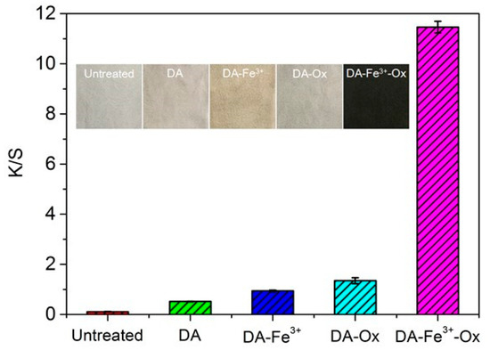Effect of adding different substances on K/S of DA-dyed silk. (DA = 2 g·L−1, Fe3+ = 2 mmol·L−1, Ox = 9 mmol·L−1, at 50 min and 50 °C).