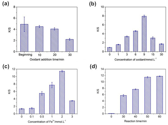 The effect of time of Ox addition (a), Ox concentration (b), Fe3+ concentration (c), and reaction time (d) on the K/S values of silk fabric. ((a) DA = 2 g·L−1, Fe3+ = 1 mmol·L−1, Ox = 15 mmol·L−1, T = 50 °C, t = 40 min; (b) DA = 2 g·L−1, Fe3+ = 1 mmol·L−1, T = 50 °C, t = 40 min (adding Ox at 20 min); (c) DA = 2 g·L−1, Ox = 9 mmol·L−1, T = 50 °C, t = 40 min (adding Ox at 20 min); (d) DA = 2 g·L−1, Fe3+ = 2 mmol·L−1, Ox = 9 mmol·L−1, T = 50 °C (adding Ox at 20 min)).