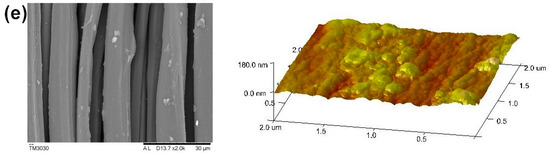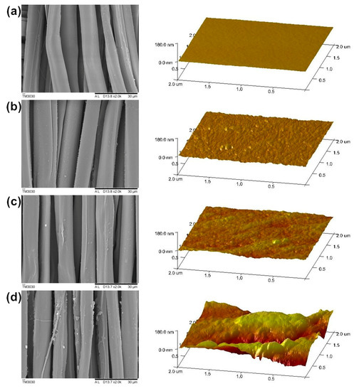 The surface morphology of silk fabric before and after DA treatment was observed via scanning electron microscopy (SEM) and atomic mechanical microscopy (AFM) (Figure 5).