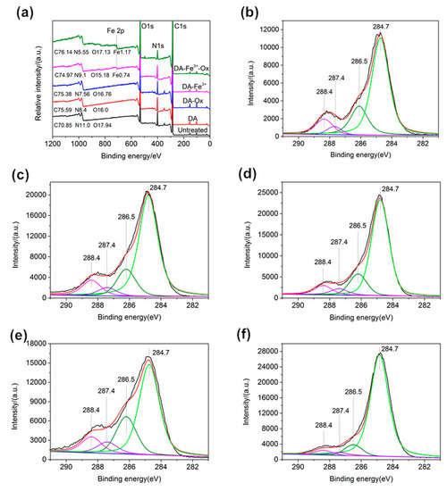 From Figure 6a, the relative C content of untreated silk sample and silk samples treated with DA, DA–Ox, DA–Fe3+, and DA–Fe3+–Ox were 70.85%, 75.59%, 75.38%, 74.97%, and 76.14%, respectively; the relative O content was 17.94%, 16%, 16.76%, 15.18%, and 17.13%, respectively; the relative N content was 11.0%, 8.4%, 7.56%, 9.1%, and 5.55%, respectively. This is because the content of silk and DA is different in element composition, and the amount of PDA deposited on silk surface is also different. In addition, the Fe content values of silk samples treated with DA–Fe3+ and DA–Fe3+–Ox were 0.74% and 1.17%. XPS mainly tested the content of the elements on the surface of the sample, so the addition of DA could change the content of the elements composition of silk surface, and the DA was successfully finished on the fabric.