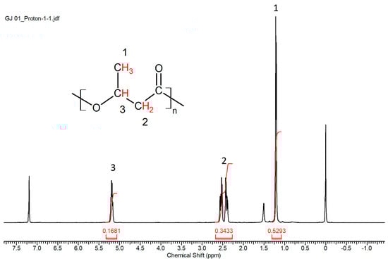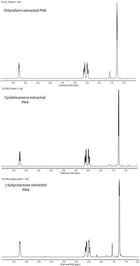 The 1H NMR spectra of the extracted PHA were recorded on a JEOL ECX-400 (400 MHz) spectrometer (Hertfordshire, UK). The solvent for the NMR experiments was chloroform-d. For the 1H and 13C spectra, 16 and 1024 scans, respectively, were used. 1H spectrum chemical shifts were referred to CHCl3 (δ = 7.25 ppm), 13C spectrum chemical shifts to CDCl3 (δ = 77.00 ppm).