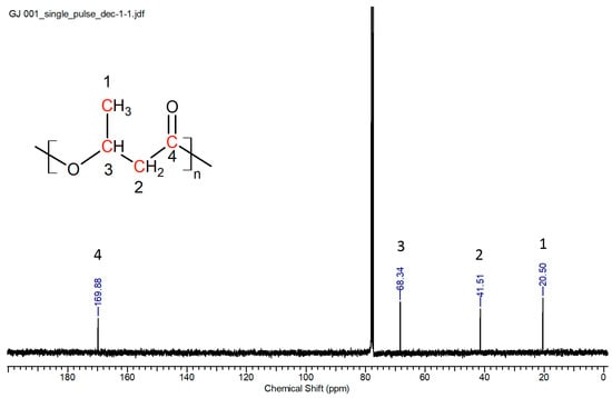 Figure 2. There were four peaks (δ = 20.5 ppm, 41.5 ppm, 68.3 ppm, and 170 ppm) in the spectrum that could be attributed to methyl carbon (side chain of 3-hydroxybuytrate), methylene carbon (backbone of 3-hydroxybutyrate), methine carbon (chiral center of 3-hydroxybutyrate), and carbonyl carbon, respectively. From both the