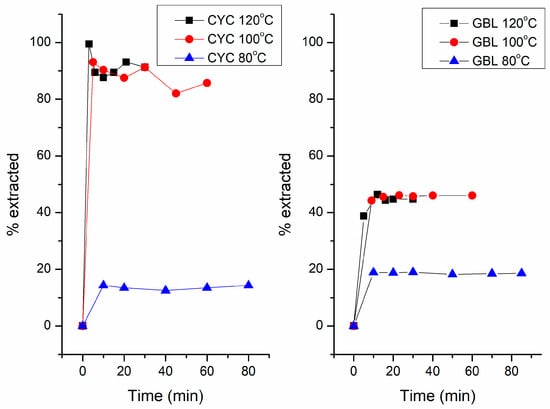 Figure 3. For each solvent, the extraction was carried out at three temperature levels: 80 °C, 100 °C, and 120 °C. The left panel of