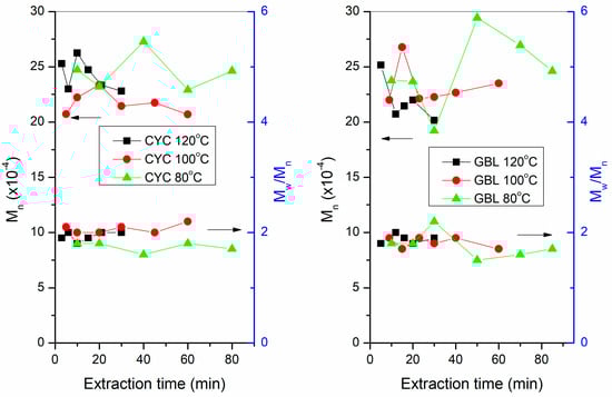 Mn) of the polymer extracted using chloroform for 24 h was 23 kDa and 2.2, respectively. For both solvents, the dispersity of the extracted polymers had a value of around 2, and the molar mass had an average value of about 23 kDa, regardless of the type of solvent and the temperature and extraction time. Moreover, the molecular weights of the extracted polymers were not significantly affected by extraction time and temperature; this is a considerable benefit when compared to the long-term extraction using halogenated solvents at high temperature where losses of molar mass due to random and chain-end scission of PHA macromolecules have been reported [