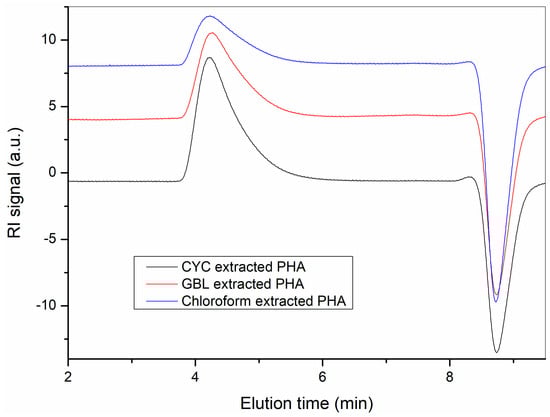 22]. A comparison of the GPC traces of the PHA extracted using CYC, GBL, and chloroform is shown in