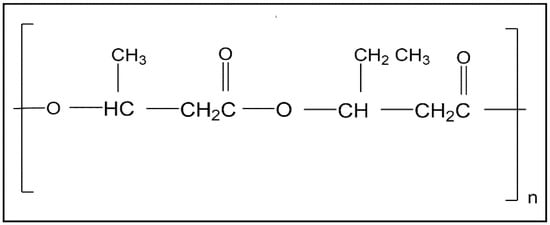 Poly(3-hydroxybutyrate-co-3-hydroxyvalerate), also known as poly(3-hydroxybutyric acid-co-3-hydroxyvaleric acid) or just poly(hydroxybutyrate-co-hydroxyvalerate), abbreviated usually as PHBV or PHBHV, originates from the insertion of 3-hydroxyvalerate (HV) units to the PHB biopolymer. PHBV is an aliphatic polyester with the chemical structure shown in Figure 2. In addition, it is non-toxic, 100% biodegradable, biocompatible with many types of cells, characterised by its high degree of crystallinity, and it is resistant to ultraviolet radiation and acceptable amounts of alcohols, fats, and oils [17,47]. However, it is a rigid and rather brittle polymer, its melting temperature is lower than PHB, and it can be dissolved in chlorinated solvents [48].
