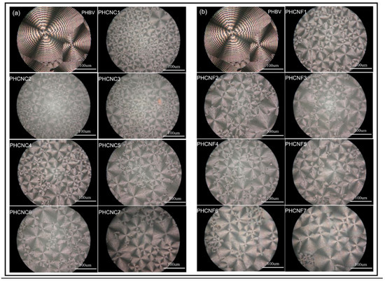 Various studies point to nanocellulose as an excellent choice for the reinforcement of PHBV, due to its unique properties, among which the following stand out: a high Young’s modulus, dimensional stability, a low coefficient of thermal expansion, exceptional reinforcement potential, and transparency [113]. Besides its mechanical properties, nanocellulose has low density, and the presence of surface hydroxyl groups facilitates the anchorage of specific chemical groups that improve its compatibility with other polymers [114]. Nanocellulose can be presented in two morphology types: cellulose nanocrystals (CNCs) and cellulose nanofibrils (CNFs). Both types improve the thermal stability of PHBV and show a reinforcement effect on the biopolymer, however, the CNCs act as a better nucleation agent because the crystals are distributed homogeneously in the polymer matrix [115]. The nucleation effect of CNCs and CNFs on crystallization behaviour of PHBV composites was studied by polarised optical microscope (POM) (see Figure 3).