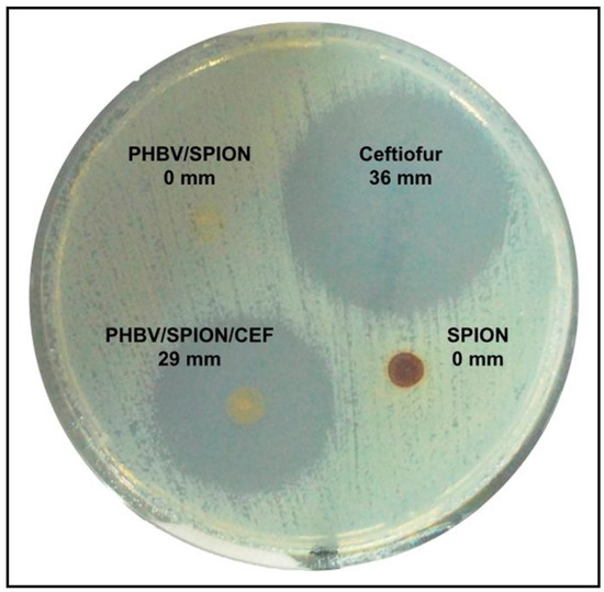 The results of this study of the PHBV/CEF/SPION nanoparticles against E. coli by the agar diffusion test showed positive antibacterial activity (inhibition halo of 29 mm) close to that of free ceftiofur (halo of 36 mm). Furthermore, the PHBV/SPION and SPION samples did not show any bacterial growth inhibition halo, as expected.