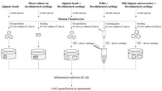 Five 3D models were considered: alginate beads (beads), decellularized cartilage (matrix), alginate beads and decellularized cartilage co-cultured (beads/matrix), pellet and decellularized cartilage co-cultured (pellet/matrix), and silk/alginate microcarriers and decellularized cartilage (microcarriers/matrix) (