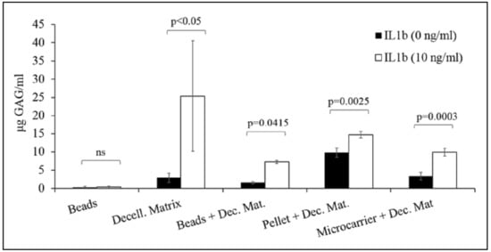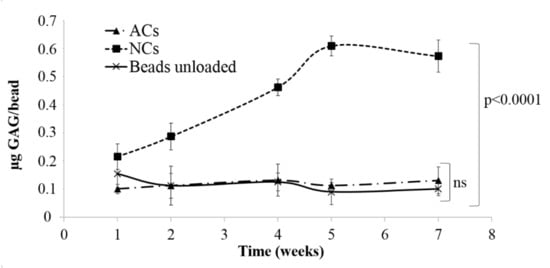 Figure 3) and GAG content increased during that time (0.43 ± 0.02 µg GAG/bead). At the same time, no significant differences were observed between encapsulated ACs (0.12 ± 0.05 µg GAG/bead) and unloaded beads (0.10 ± 0.02 µg GAG/bead) during all considered period (