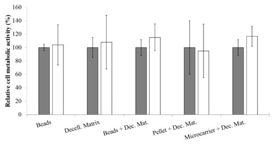 Figure 4). Statistical analysis showed that both variables (3D model and treatment) do not significantly influence NCs metabolic activity. However, after treatment with IL-1β, beads, decellularized matrix, and pellet + decellularized matrix models, presented an increase of data dispersion, indicating that these culture conditions lead to different metabolic activity depending on the sample statistical unit. On the other hand, for beads + decellularized matrix and microcarrier + decellularized matrix models, the treatment with IL-1β leads to lower data dispersion and to an increased metabolic activity (although not significant,