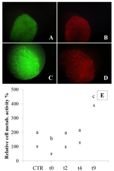 p < 0.05). These results were also confirmed by live-dead assay, that confirmed 90% of cell viability after two days of culture (