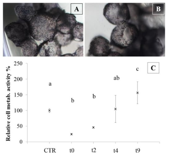 In particular, the bead model is the most useful for this purpose because encapsulation preserves different cell lines from cryopreservation damage. The MTT test, performed before cryopreservation (control) and after thawing (0, 2, 4, and 9 days of culture) on encapsulated NCs, showed that post-thawing, two days of culture are required to resume cell metabolism at basal state (