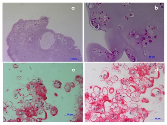 Histological investigation was performed on NCs encapsulated in alginate beads cultured for 35 days, cryopreserved and then thawed, to evaluate cell morphology and functionality. Hematoxylin-eosin staining showed that cells were spherical, with shaped-central nucleus and basophilic cytoplasm, similar to the natural cartilage morphology (