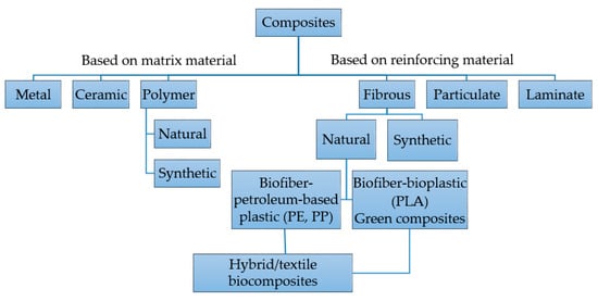 Classification of composites (polyethylene (PE), polypropylene (PP), and polylactic acid (PLA)). Reproduced with permission from []. John Wiley and Sons, 2012.