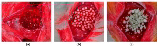 (a) Alginate; (b) HA/alginate; and (c) SF/HA/alginate beads were grafted into rat calvarial defects (silk fibroin (SF) and hydroxyapatite (HA)). Reproduced with permission from []. MDPI, 2017.