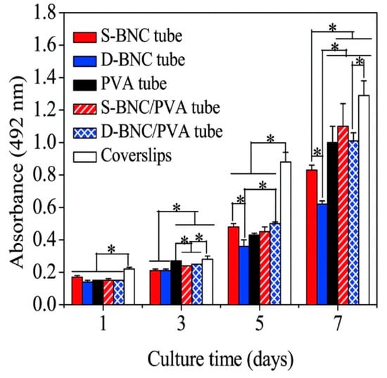 Bacterial nanocellulose (BNC), structured by repeated β-1,4 linked D-glucose dimers, has been reported to provide some novel properties, such as an ultrafine nanofiber matrix; high water holding capacity, crystallinity, and chemical purity; and excellent biocompatibility and wet tensile strength [,]. For instance, Tang et al. [] evaluated BNC composite tubes doped with PVA as artificial blood vessels. The neat BNC tubes were considered to be an inadequate model for vascular grafts due to water leakage and poor suture retention. The water permeability and tensile characteristics were enhanced after blending BNC tubes with PVA. The mechanical properties of the fabricated composites were controlled by the BNC tube content. Two tubular bioreactors were employed for the processing of BNC tubes. The tubes produced from the first bioreactor which was assembled with an about 60 mm silicone tube (inner diameter × external diameter: 2 × 3 mm) and a glass tube (8 × 10 mm), were defined as S-BNC tubes. The other bioreactor was consisted of two silicone tubes with various calibers (2 × 3 mm, 8 × 9 mm), were defined as D-BNC tubes. The D-BNC/PVA composite exhibited a higher tensile strength when compared to S-BNC/PVA composite. This criterion is favored for veins and artery transplantation. Figure 3 describes the proliferation of pig iliac endothelium cells (PIECs) on coverslips, BNC tubes, BNC/PVA composite tubes, and PVA tubes at 1, 3, 5, and 7 days after cell seeding.