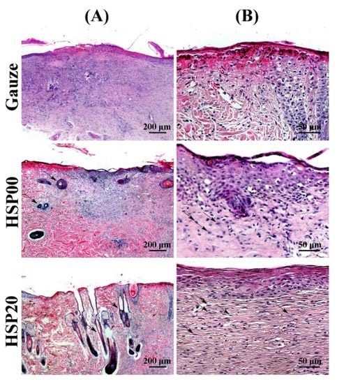 Histological measurement of the skin treated with gauze, HSP00, and HSP20 hydrogel at the 13th day by H&E staining: at (A) 50× and (B) 200×. Reproduced with permission from []. Elsevier, 2017.