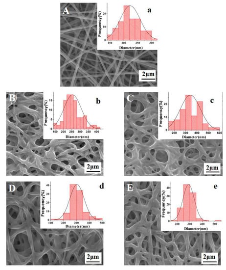 SEM images and diameter distributions of FK/PVA/PEO nanofiber membranes: (A) without treatment; (B) 3h-C; (C) 12h-C; (D) 3h-G; and (E) 12h-G. The insets show the diameter-distribution of corresponding samples (for example, 3h-C refers to the FK/PVA/PEO nanofiber membranes crosslinked by citric acid vapor for 3 h. C and G are the English initials abbreviation of citric acid and glyoxal, respectively; 3 h is the crosslinking time).