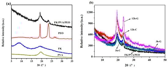 The XRD spectra of the pure components (FK, PVA, and PEO), as-prepared FK/PVA/PEO nanofiber membrane, and vapor-assisted crosslinked FK/PVA/PEO nanofiber membranes are shown in Figure 3. The broad diffraction peaks at 2θ = 9° and 19° correspond to the α-helix and β-sheet structure of FK, respectively [21]. Moreover, the broad nature of XRD peaks indicates the partially crystalline nature of the prepared material. The XRD pattern of PVA gives a typical diffraction peak at 2θ = 19° [19]. The sharp diffraction peaks at 2θ = 19° and 23° indicate the highly crystalline nature of PEO [24]. The XRD pattern of FK/PVA/PEO nanofiber membrane has exhibited the similar pattern as of FK, PVA, and PEO. The sharp diffraction peaks were observed at 2θ = 19° and 23°. The broad peak at 2θ = 9°, corresponding to FK, did not appear in the XRD pattern of FK/PVA/PEO membranes. Moreover, the lower intensity of the peak at 2θ = 23° suggests that the overall crystallinity of the FK/PVA/PEO nanofiber membrane is slightly lower than PEO. The results show that pure components are not just physically mixed, but strong molecular interactions have been generated. Hence, the regularity and crystalline structure of the original molecules has been reduced.