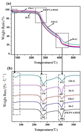 The thermal analysis of as-prepared and crosslinked FK/PVA/PEO nanofiber membranes: (a) TGA curves; and (b) DTG curves.